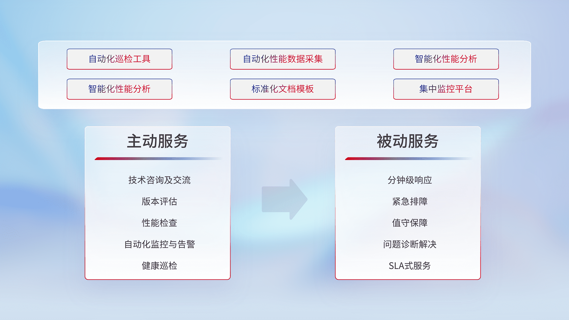 智能化工具和标准化文档,,,保障服务质量,,提供主动服务(包含技术咨询、、版本评估、、、、性能检查、、、自动化监控与告警、、健康巡检)和被动服务包含(分钟级响应、、、、紧急排障、、、值守保障、、、问题诊断解决、、、、SLA服务)。。。。